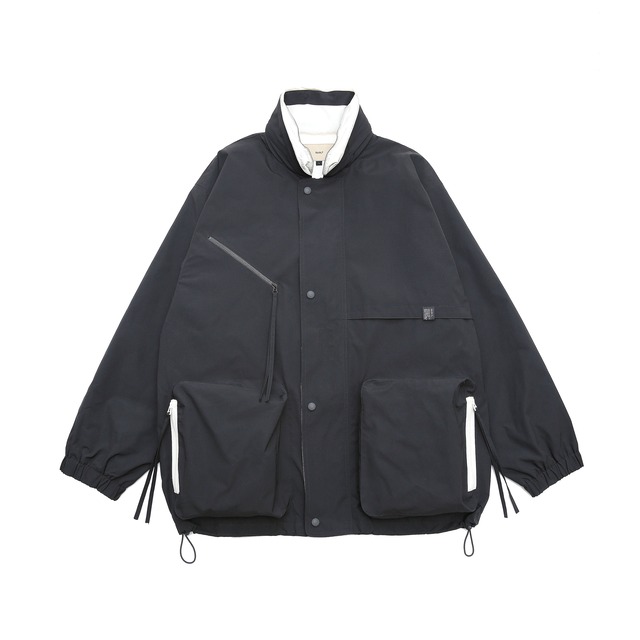 ふくらみのあるフロントポケットが特徴的なアウタージャケット。 衿周りの補強テープやジッパー引き手もデザインのアクセントになります。 背中に独特な形状の切り替えを施す事で、丸みをもたせながらも、すっきりとしたシルエットを実現。 裏地に防風性のある生地を施し、内ポケットを搭載。 衿にはフードを内包し、裾をドローコードで絞る事が可能。 color : BLACK (サイズ) 身幅 M : 63cm L : 67cm 裾幅 M : 63cm L : 67cm 着丈 M : 74cm L : 77.5cm MATERIAL : POLYESTER 100%, LINING : POLYESTER 100% [ Lサイズ着用 ] モデル(白人)→ 身長185cm モデル(黒人)→ 身長182cm