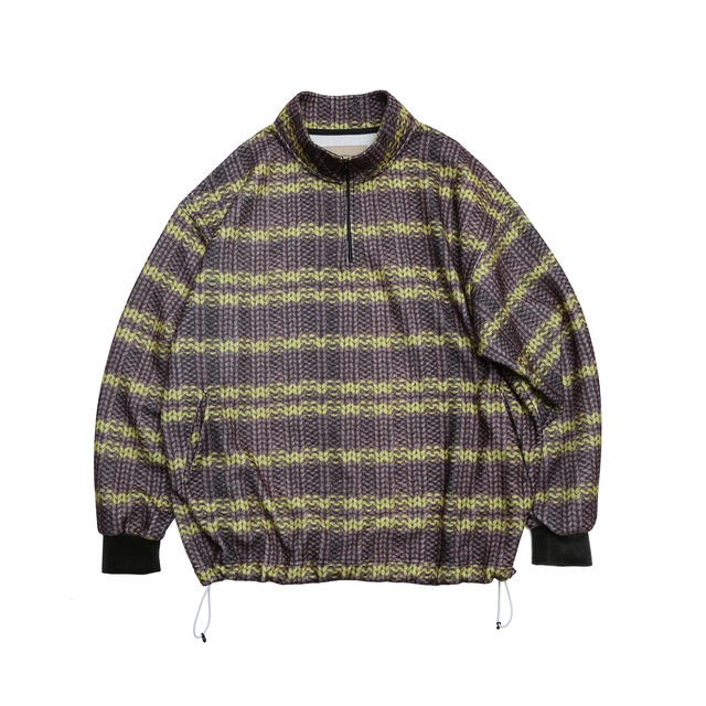 ボーダー柄を転写プリントした別注生地を使用したプルオーバー。 裏側はメッシュ編みのため肌触りがよく、快適な着用感となります。 袖リブにはベロア調のコーデュロイニット生地を採用しています。 裾のドローコードで着丈、シルエットを調節可能。 color : BROWN-LIME 身幅 M: 62cm L: 66cm 着丈 M: 70cm L: 73.5cm MATERIAL : PORYESTER 95%, PU 5% (袖生地):COTTON 50% PORYESTER 47%,PU3% ( 着用サイズ L ) モデル(男性)→身長182cm モデル(女性)→身長164cm