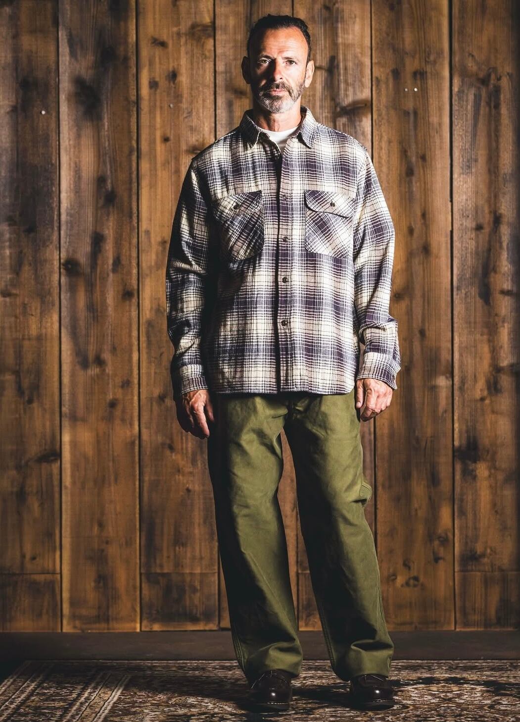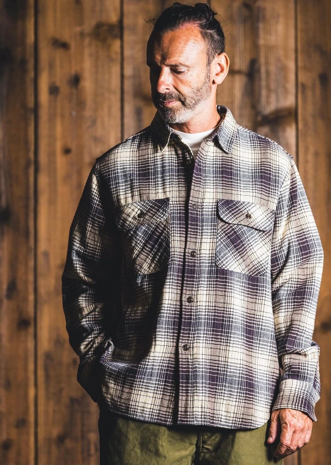 このシャツに使用されているフランネルチェックは、ウールツイードのプロセスを使用して綿 100% で製造されています。
