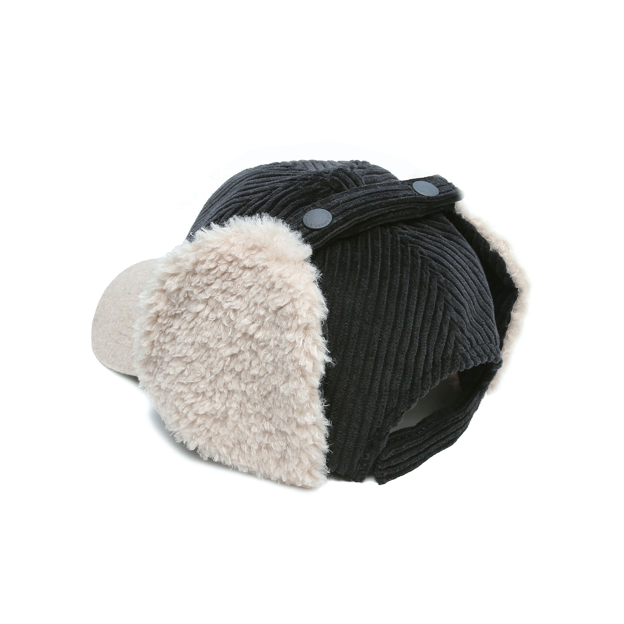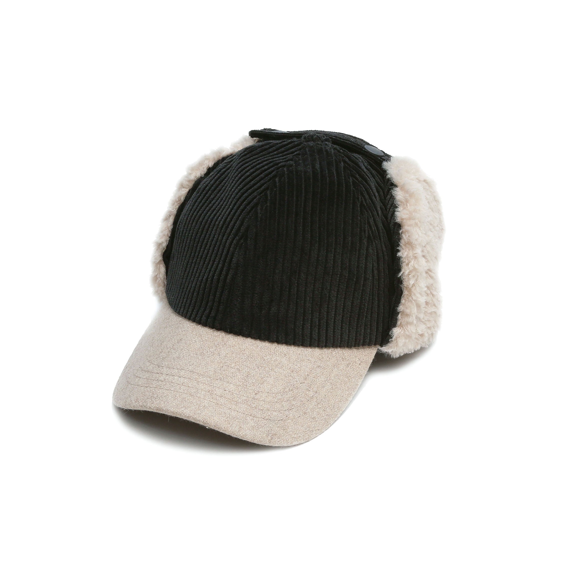 太畝コットンコーデュロイ生地とウール調生地を組み合わせた耳当てつきキャップ。