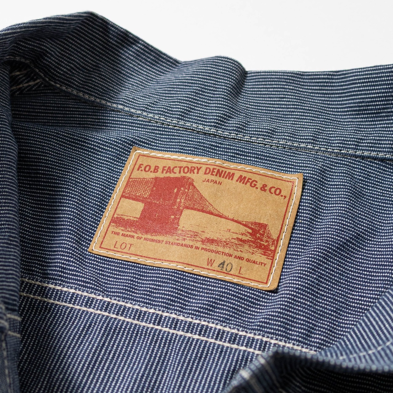 生成りのコットン糸を使用し、全て巻き縫いで縫製し、リベットによる補強が施され、F.O.B FACTORYらしい作り込みが印象的な一着。