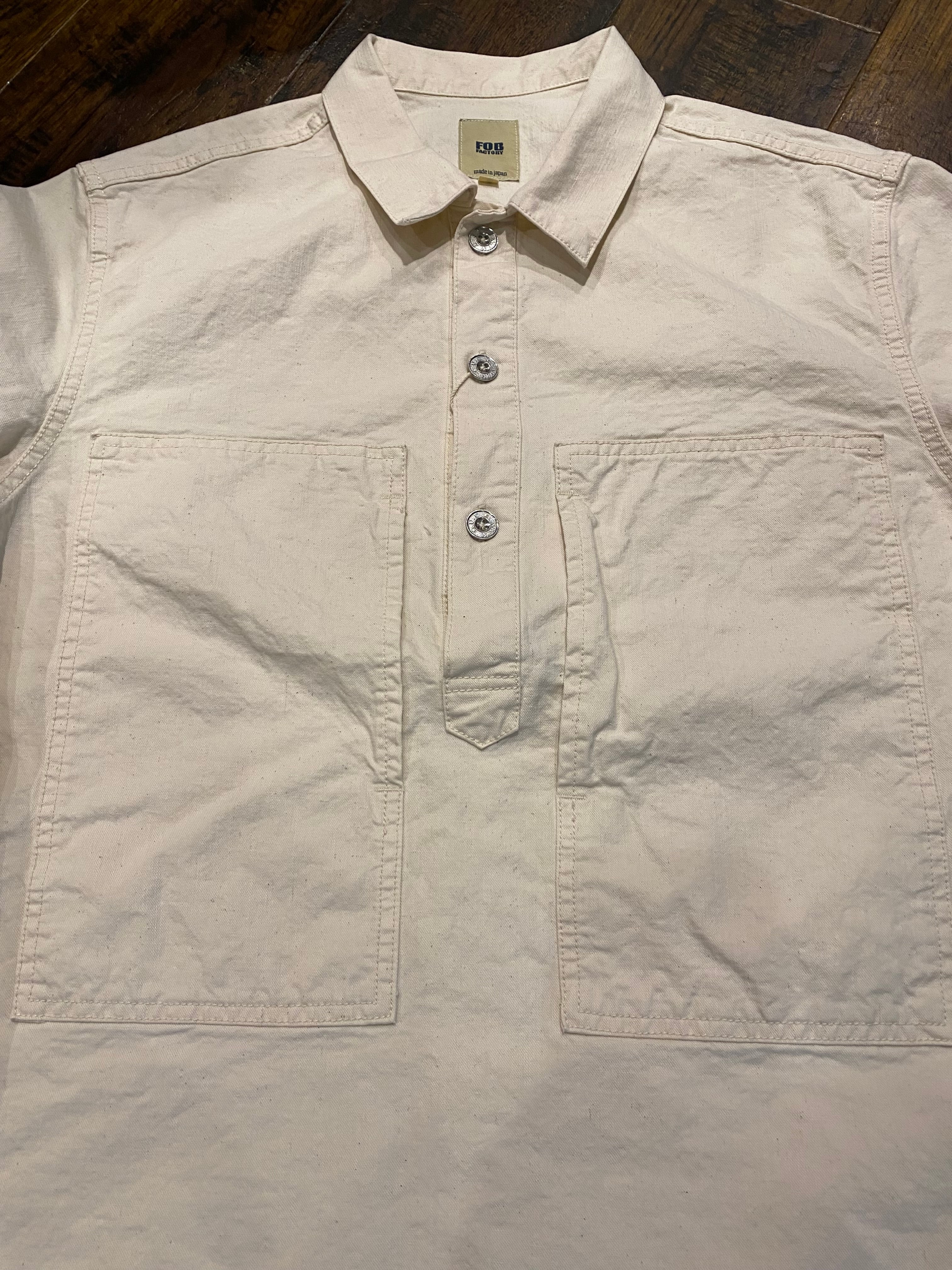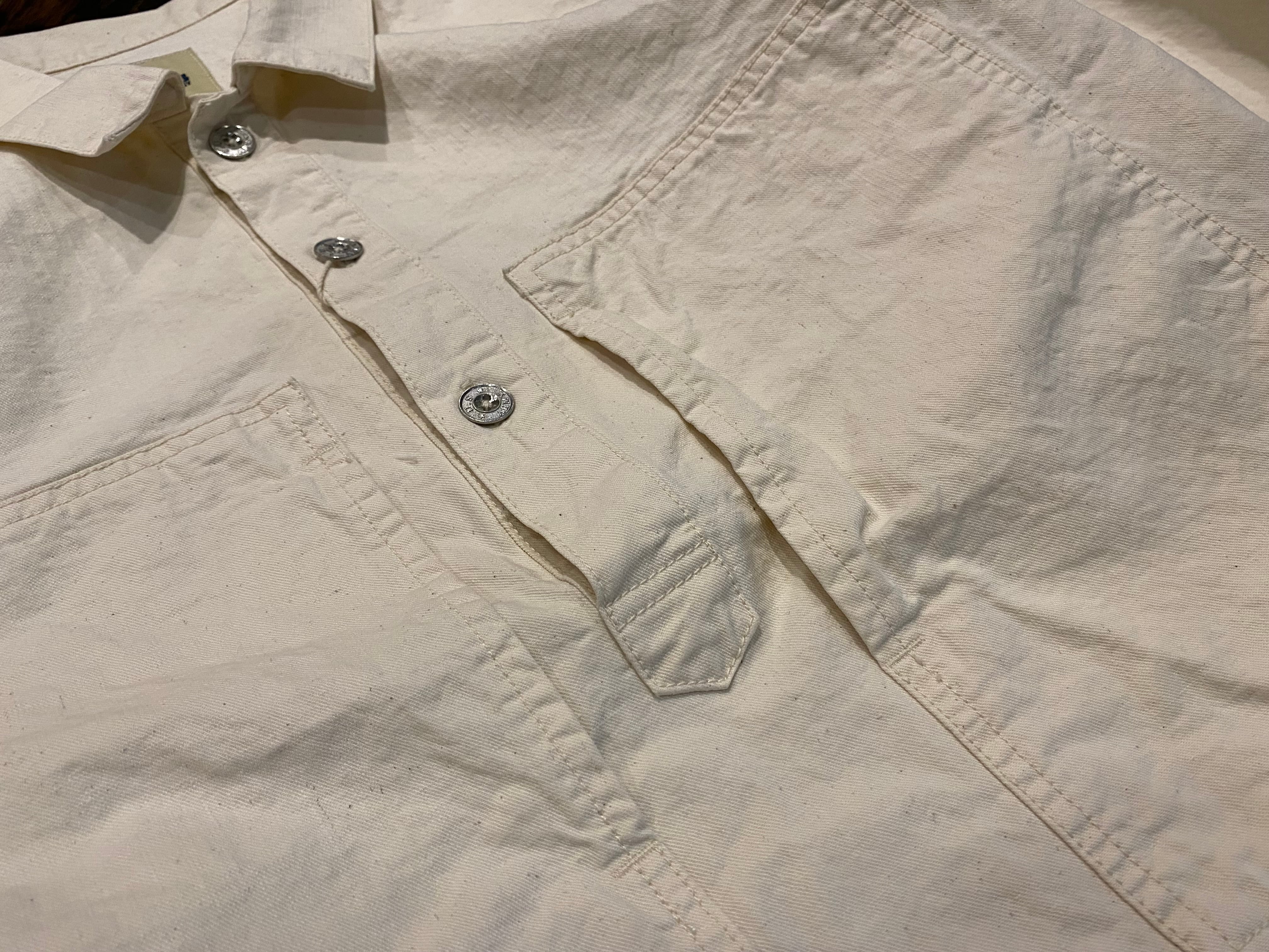 この生地でプルオーバーシャツを製作し、後加工でSTONE WASHを入れ、生地を少しくたらせ、こなれた雰囲気に仕上げました。